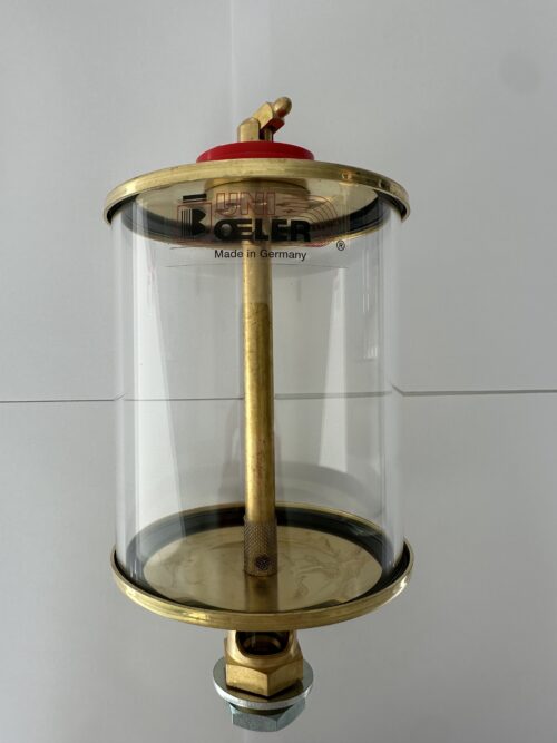 Oliedruppelaar type UNI volgens DIN 3401, vervaardigd uit gebeitst messing en voorzien van een regelspil voor een uiterst nauwkeurige instelling van de druppeldosering. De toevoer kan onmiddellijk worden onderbroken (instant cut-off). Uitgerust met een klapdeksel voor eenvoudige bijvulling en een cilindrisch kijkglas voor een duidelijke visuele controle van het druppelgedrag. Leverbaar met cilindrisch glas in acrylglas of mineraalglas*, afhankelijk van de toepassing en temperatuurvereisten.